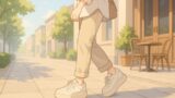 昼下がりの街角を、黒いキャンバス オールスター OXを履いた女性が歩くアニメイラスト。白いシャツにロールアップしたデニムパンツ姿で、石畳の道とカフェの外観が穏やかに描かれている。 ファッション